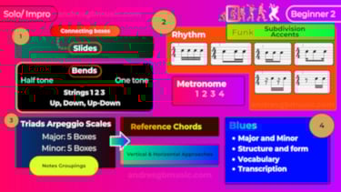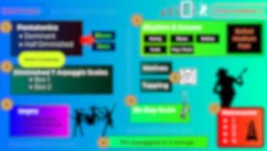 Learn to play over blues structures, learn to absorb what you love from your favourite artists as B.B. King, Stevie Ray, Eric Clapton, Albert Lee, etc...
